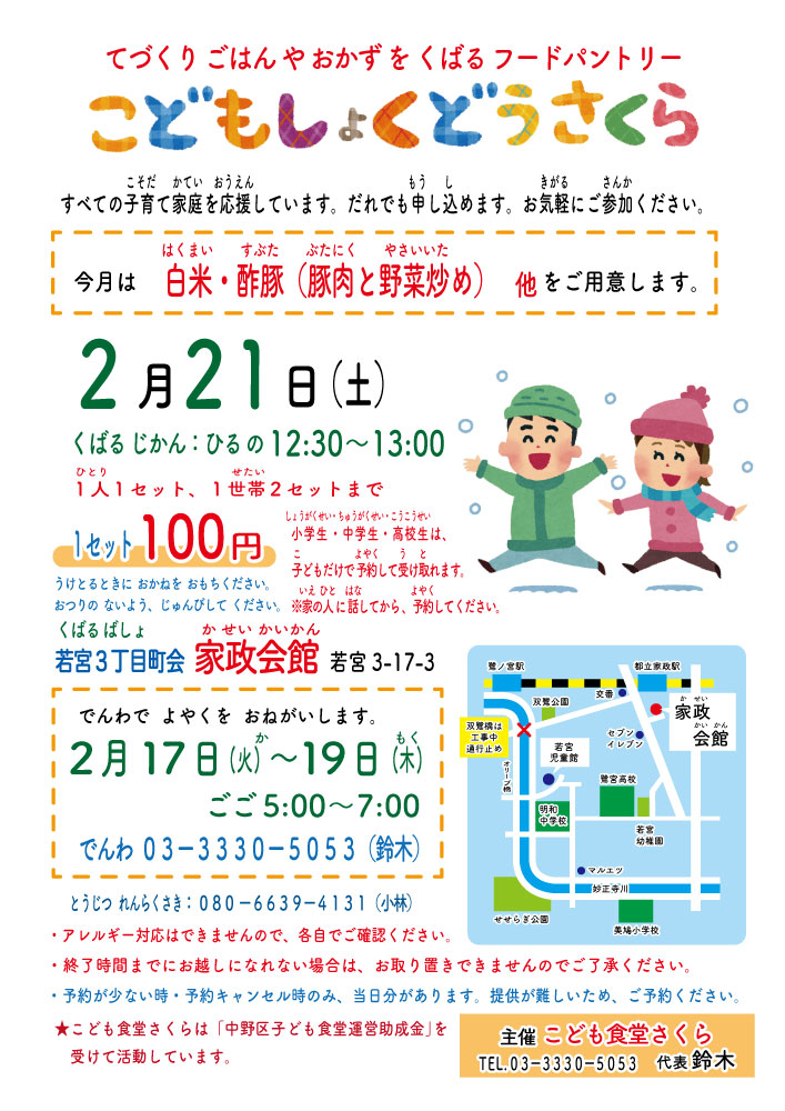次回は2月21日(土)12時半から13時受け取り、場所は家政会館です。